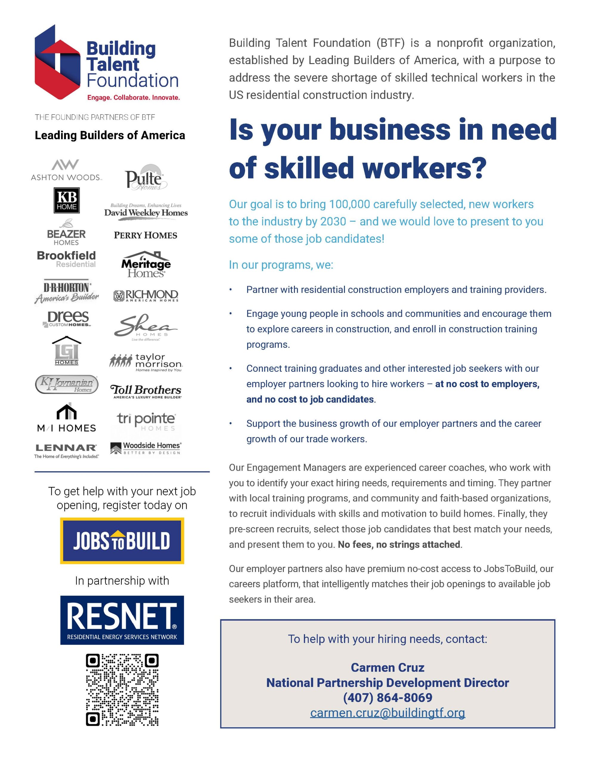 RESNET and the Building Talent Foundation (BTF) are collaborating to promote Home Energy Ratings System (HERS®) careers, connect job-seekers with employers in the sector, and improve engagement and retention. Now, together we have launched a RESNET jobs page, specifically for HERS®-related job openings at JobstoBuild.com. Available at no cost to RESNET Providers, Rating Companies, builders, and other stakeholders: Access to RESNET-branded landing career platform page, using the QR code below or visiting https://jobstobuild.com/page/RESNET Priority job listings, to promote open HERS®-related jobs, and connect with qualified candidates. Work with BTF’s Engagement Managers, experienced career coaches, who will help identify your exact hiring needs, requirements, and training. Engagement Managers partner with local training programs, and community organizations to recruit individuals looking to join the industry and those who are moving from other positions in construction. Engagement Managers pre-screen recruits and select those job candidates that best match your needs and present them to you. With the growth in the demand for HERS® Index ratings, RESNET needs a steady flow of professionals entering the industry as Quality Assurance Designees, HERS® Raters, Rating Field Inspectors, and Energy Modelers. RESNET and BTF are working together to promote HERS® Raters designation to BTF’s education and recruiting partners. BTF will add career path and education information to the career exploration section of JobsToBuild.com and will promote HERS® careers directly through their student and employer networks.