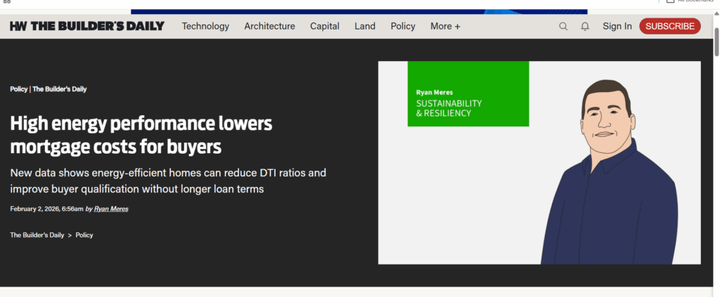 Ryan Meres, RESNET® Programs Director, is a frequent contributor to The Builder’s Daily newsletter. In his latest article, “High Energy Performance Lowers Mortgage Costs for Buyers”, Ryan discusses how factoring energy savings into mortgage underwriting can reduce debt-to-income ratios and improve affordability. Recent policy changes and studies show that energy-efficient homes offer lower default risk and greater buying power than traditional underwriting. Read the full article here