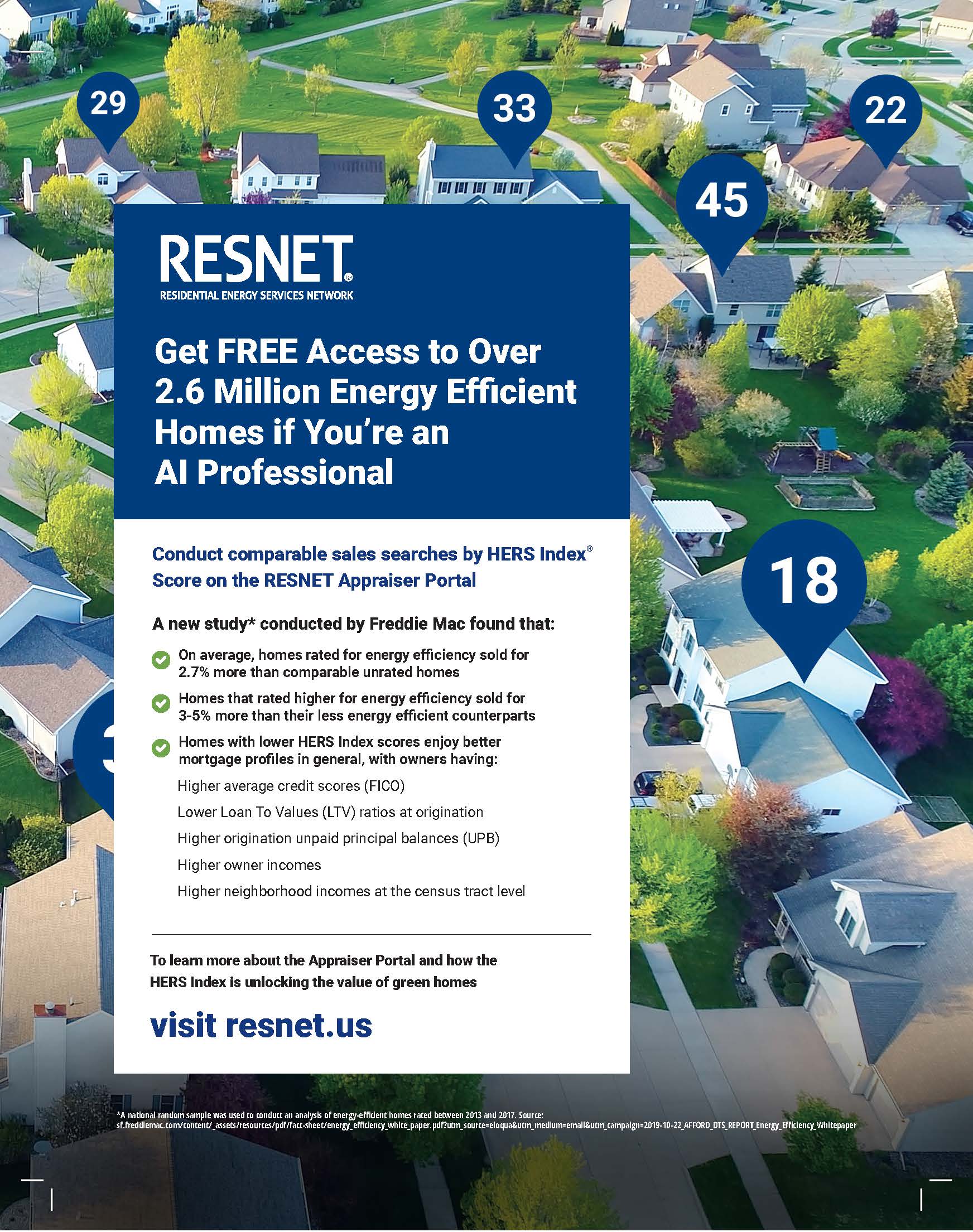 The Quarter 1, 2020 issue of Valuation magazine featured the RESNET Appraisal Portal. The coverage included a full-page display (above) and the following story, “Appraisal Institute Partnership with RESNET Gives Appraisers Access to HERS® Home Ratings.” The Appraisal Institute and Residential Energy Services Network (RESNET) on March 20 announced an agreement where AI professionals now have free access to RESNET’s national registry of Energy Rating System-rated properties. RESNET’s Appraisal Portal lets appraisers conduct comparable sales searches of more than 2.6 million energy-efficient homes by city, state, ZIP code or address filtered by HERS® rating, builder and year of construction. The mortgage lending procedures for home valuations are changing and now more than ever, appraisers and HERS® Raters must engage to ensure the value of the procedure of high-performance homes when hybrid appraisals and AVMs are substituted for traditional appraisals. It is vital to understand these products and the importance of documenting the facts on houses that are high performing and to identify ways to make high performance more transparent. Developed by RESNET (Residential Energy Services Network) and introduced in 2006, the HERS® Index is the nationally recognized system for inspecting and calculating a home’s energy performance. Learn more at https://www.resnet.us/appraisers/appraisal-portal/